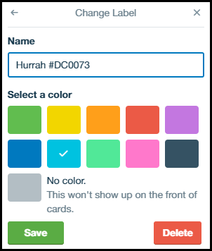 I would like to add Multiple custom labels WITH COLORS to trello right ... This error message can happen if you set a custom text value in the Label field. Changing it to a default color from the dropdown should solve the issue. If you want to dynamically set the label, you'll need two extra steps: Find/create label (searching on the label name from a previous step) Add label to card Can I add more color label options to organize my ... We have a fairly small editorial team for our organization's blog and we've been able to use a simple color-code system that allows us to easily see what each person is currently working on, completed, or published based on their specific color + color of status (yellow, green or red). However, as ... Custom Color Labels : r/trello - Reddit 23 Jan 2020 — But we can't have one color system for every other thing we do and app we use, and then a different set of colors for Trello. It's become too ... NEW in Trello: More colors added to Trello labels! - YouTube Wish you had more than 10 color options in Trello? Your wish has been granted. Trello just added 20 more color options to your label settings! Time to go sty...